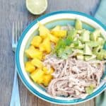 When pork is done, shred with two forks. Combine approximately 1 pound of the cooked pork with rice mixture, and add in avocado and mango. {Save any extra pork for lunch or dinner tomorrow!}